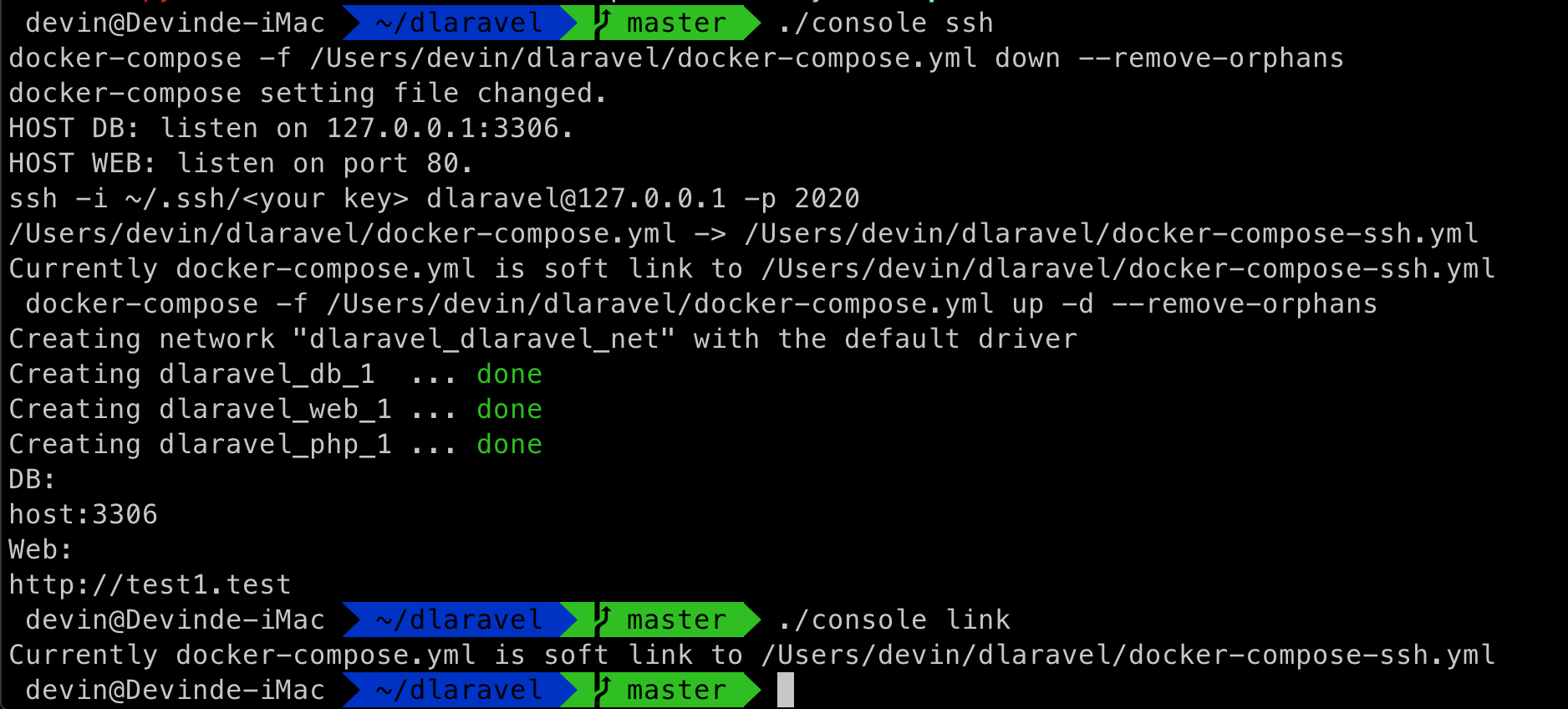 ./console ssh這個指令,會在D-Laravel的目錄建立軟連結,我們能透過./console link指令確認。